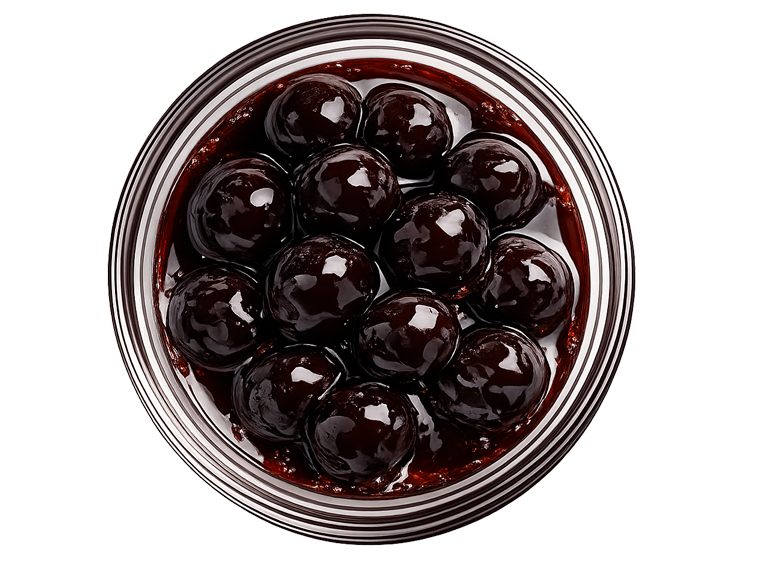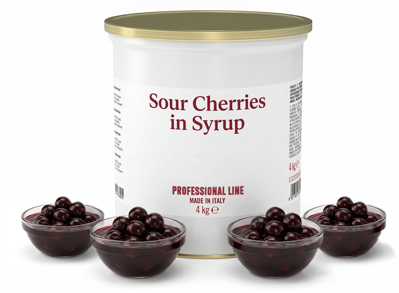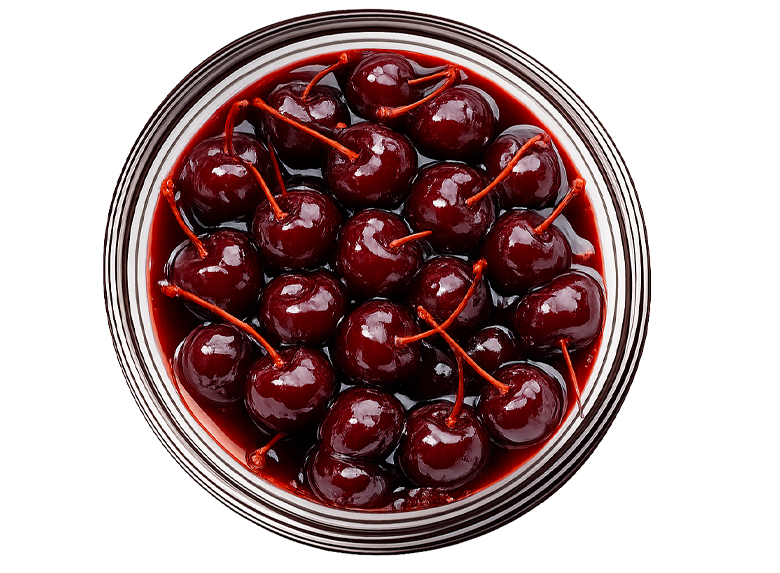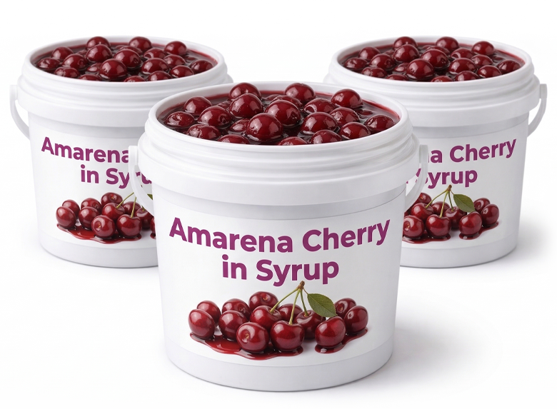Premium-quality Amarena and Sour cherries in syrup, processed for industrial use.
