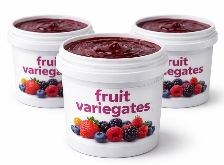 High-performance fruit variegates with natural flavours and real fruit pieces, developed for professional and industrial applications in ice cream and frozen desserts.